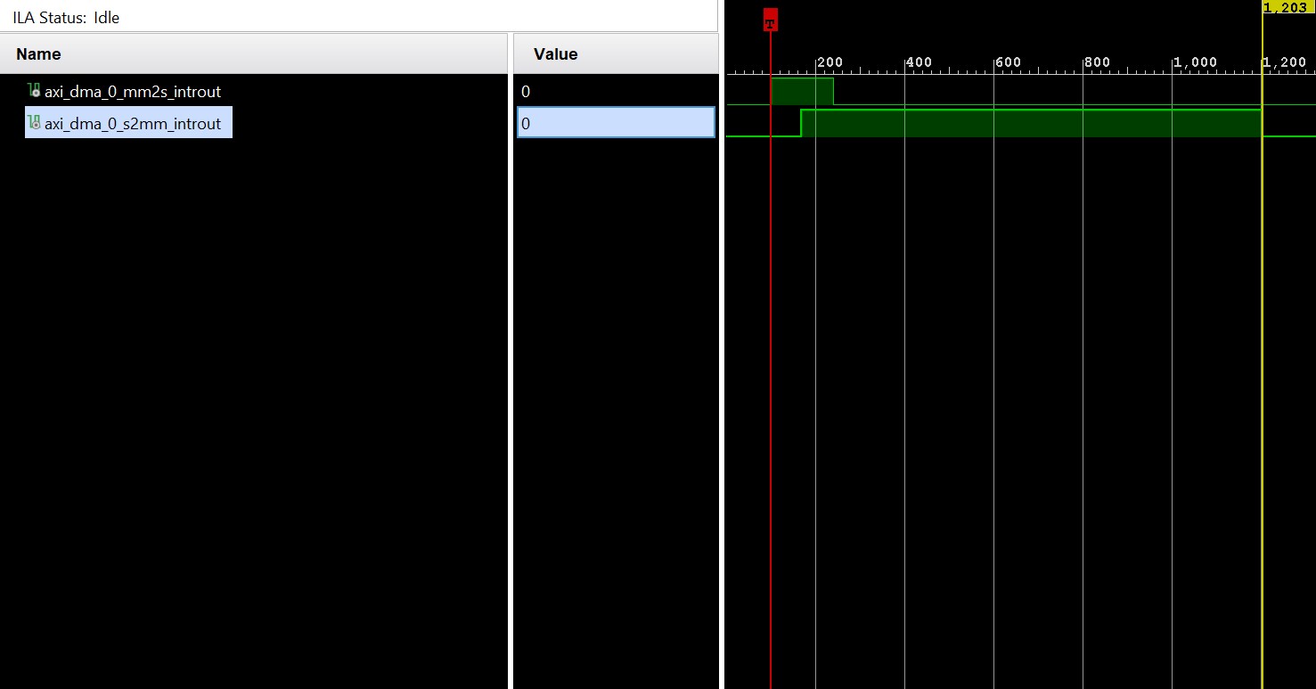---- Entering main() --- ---- MM2S Interrupt is Active ---- ---- S2MM Interrupt is Active ---- Data valid 0: sent C = received C PASS ... Successfully ran AXI DMA interrupt Example ---- Exiting main() ---